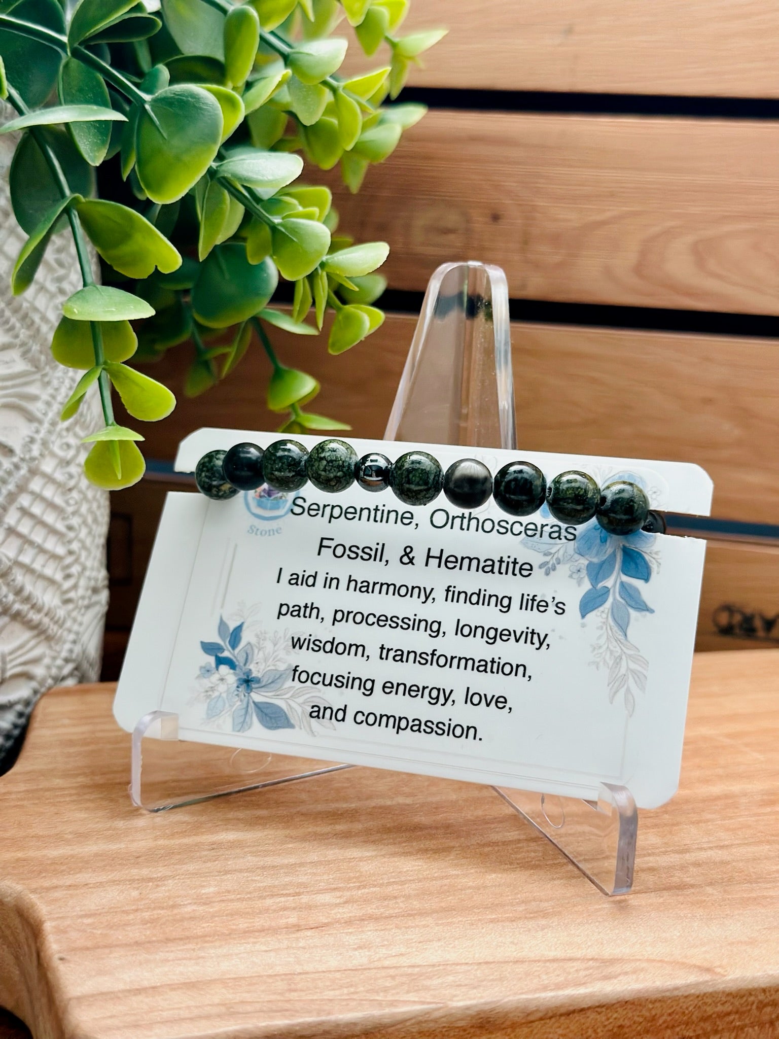 Serpentine, Orthosceras Fossil, & Hematite Bracelet