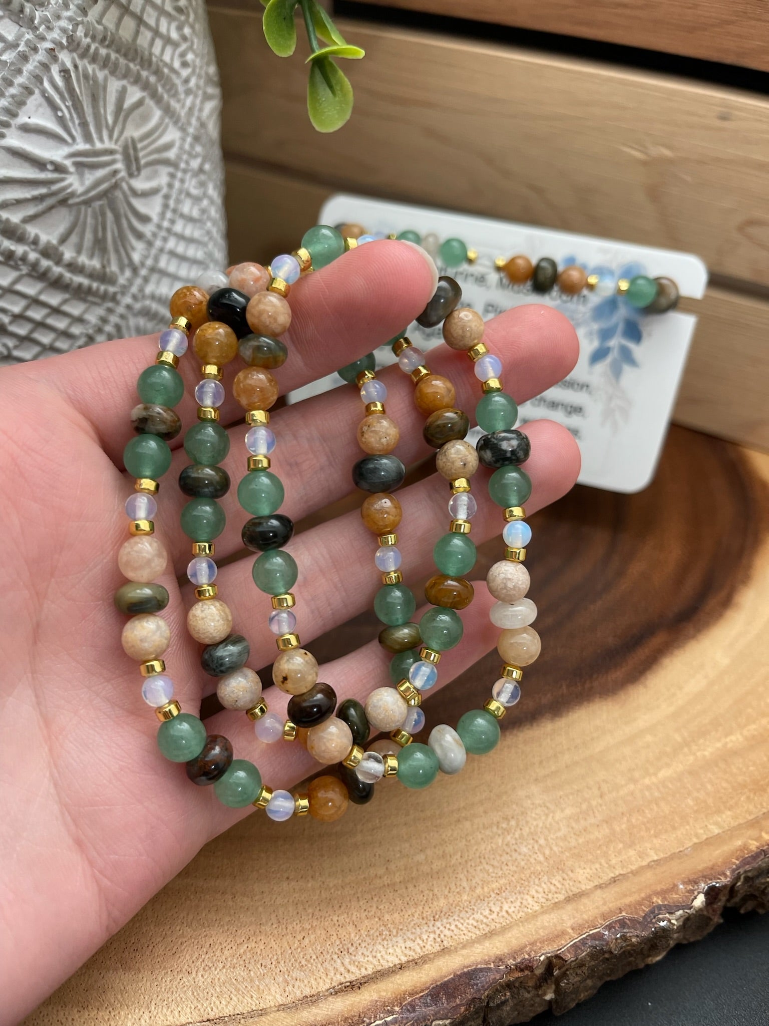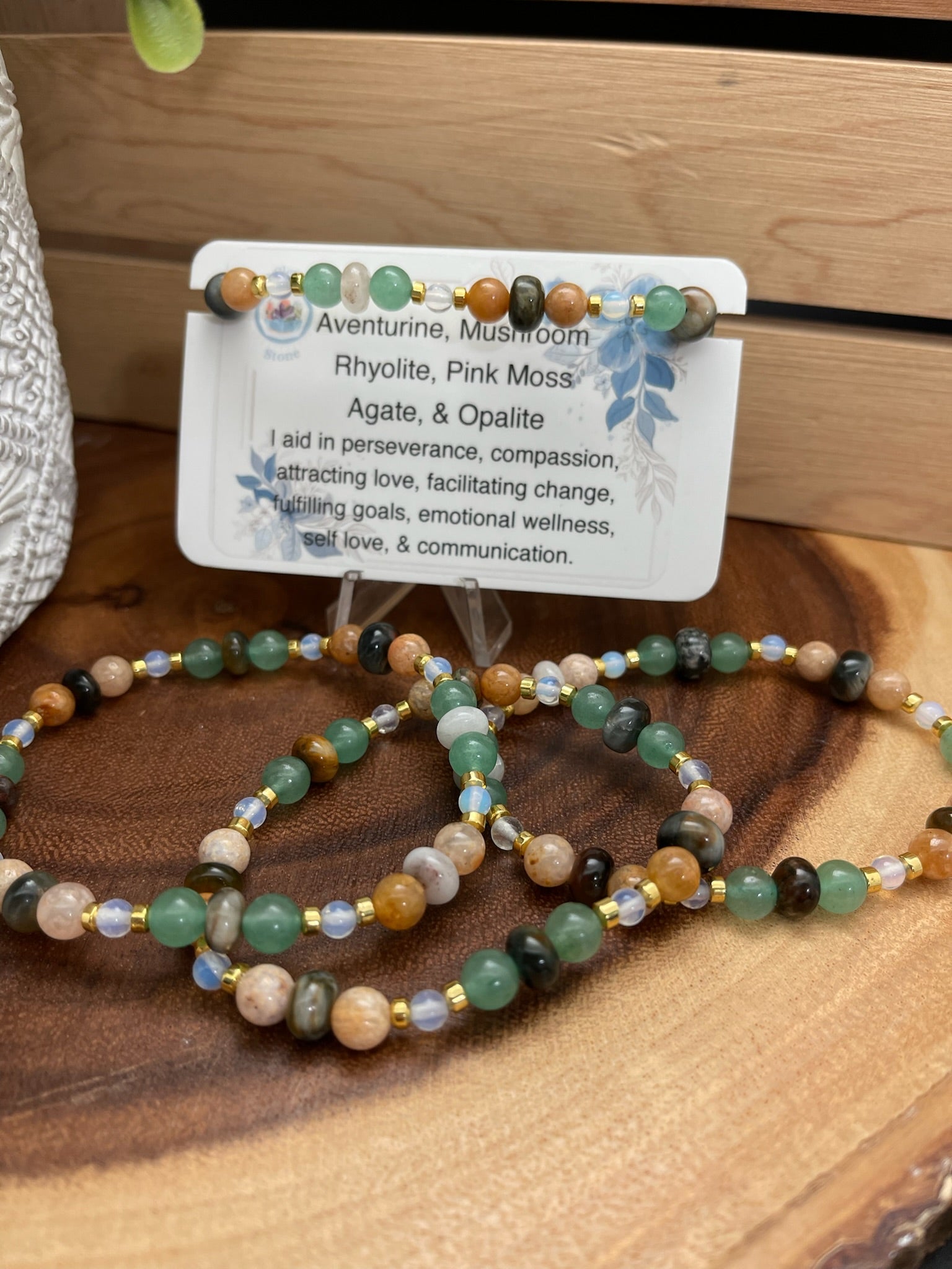 Aventurine, Mushroom Rhyolite, Pink Moss Agate, and Opalite Bracelet