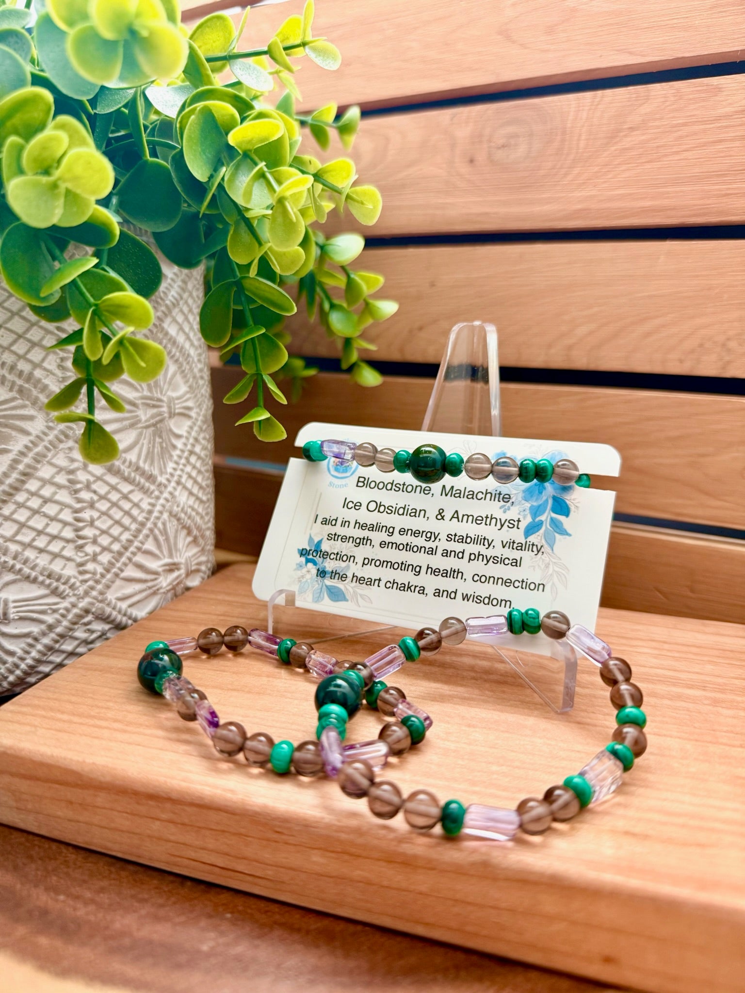 Bloodstone, Malachite, Ice Obsidian, & Amethyst Bracelet