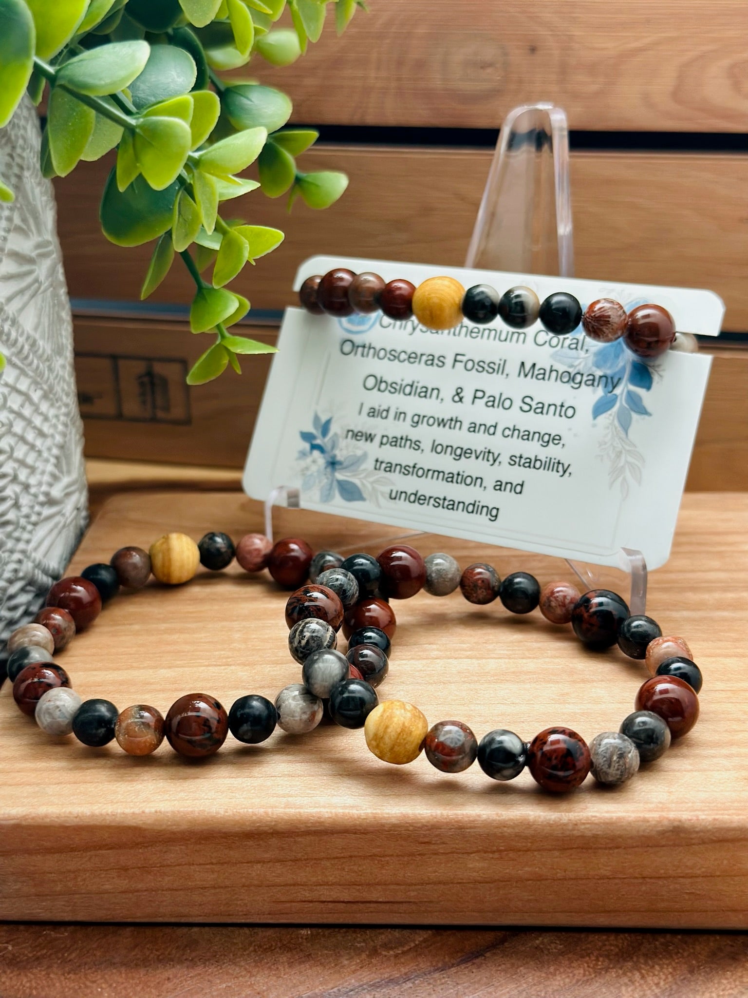 Chrysanthemum Coral, Orthosceras Fossil, Mahogany Obsidian, & Palo Santo Bracelet