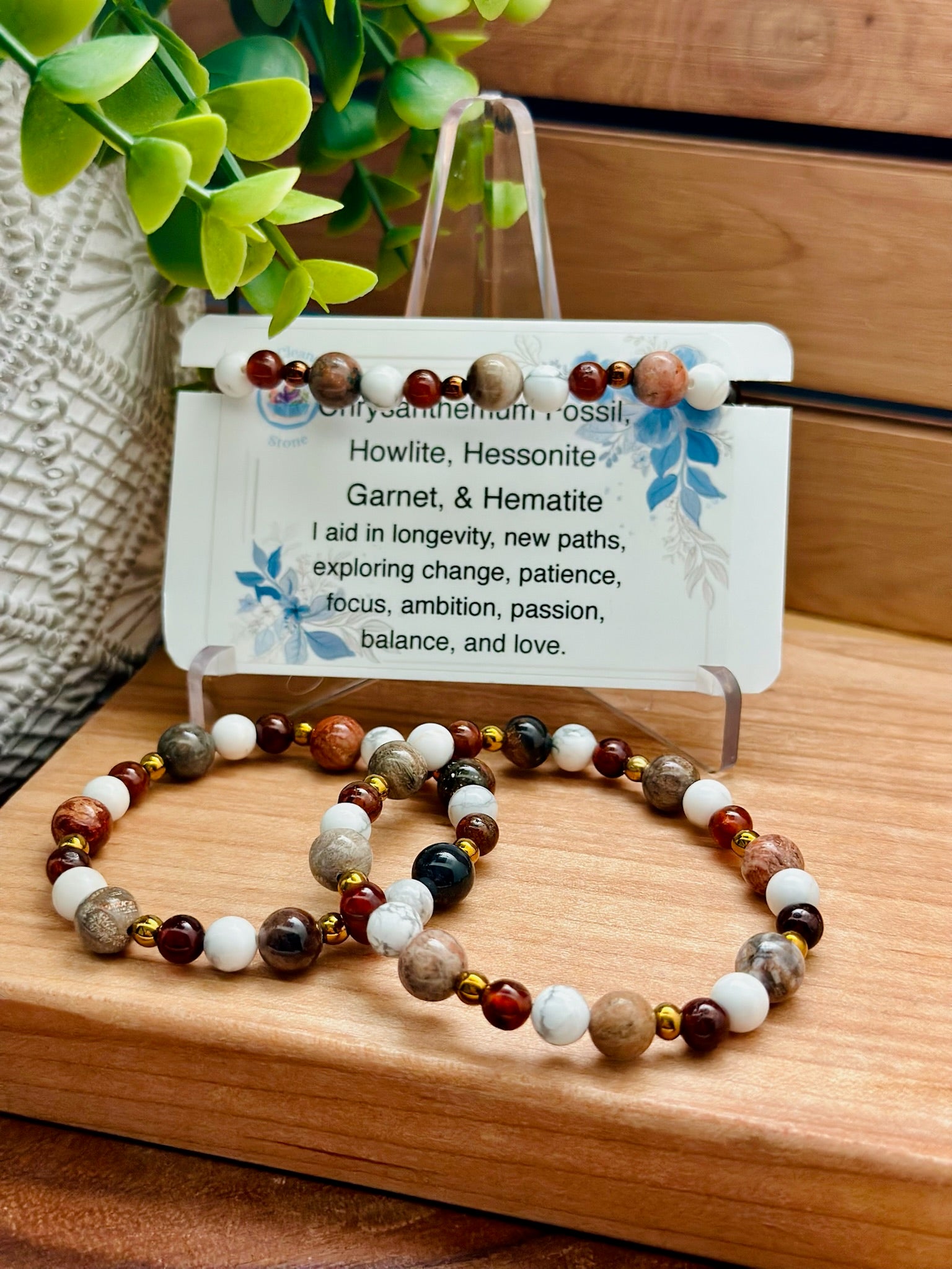 Chrysanthemum Fossil, Howlite, Hessinite Garnet and Hematite Bracelet