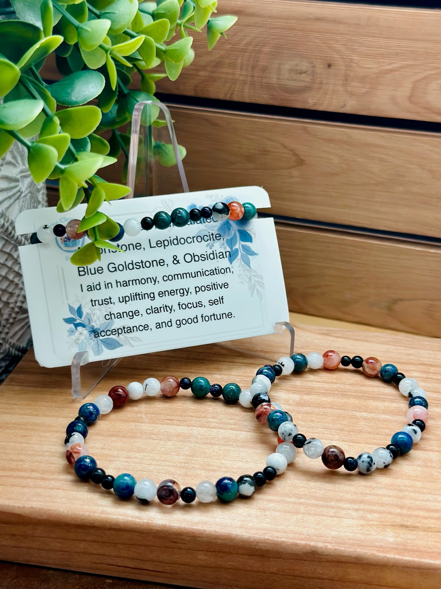 Chrysocolla, Tourmalated Moonstone, Lepidocrocite, Blue Goldstone, & Obsidian Bracelet
