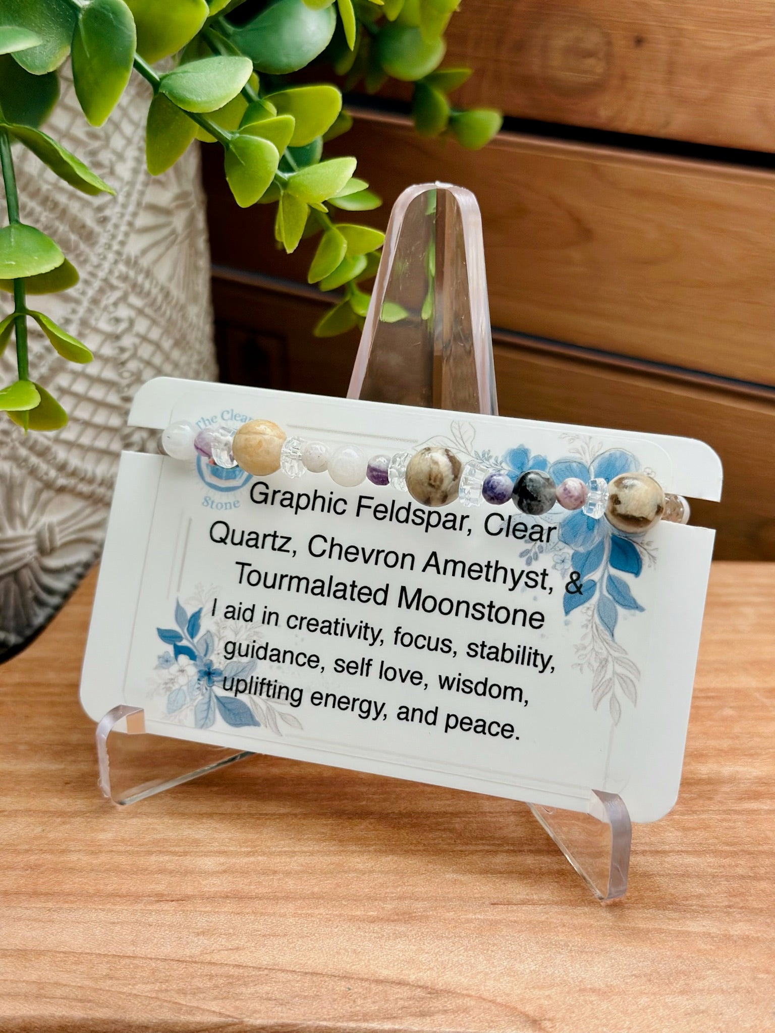 Graphic Feldspar, Clear Quartz, Chevron Amethyst, and Tourmalated Moonstone Bracelet