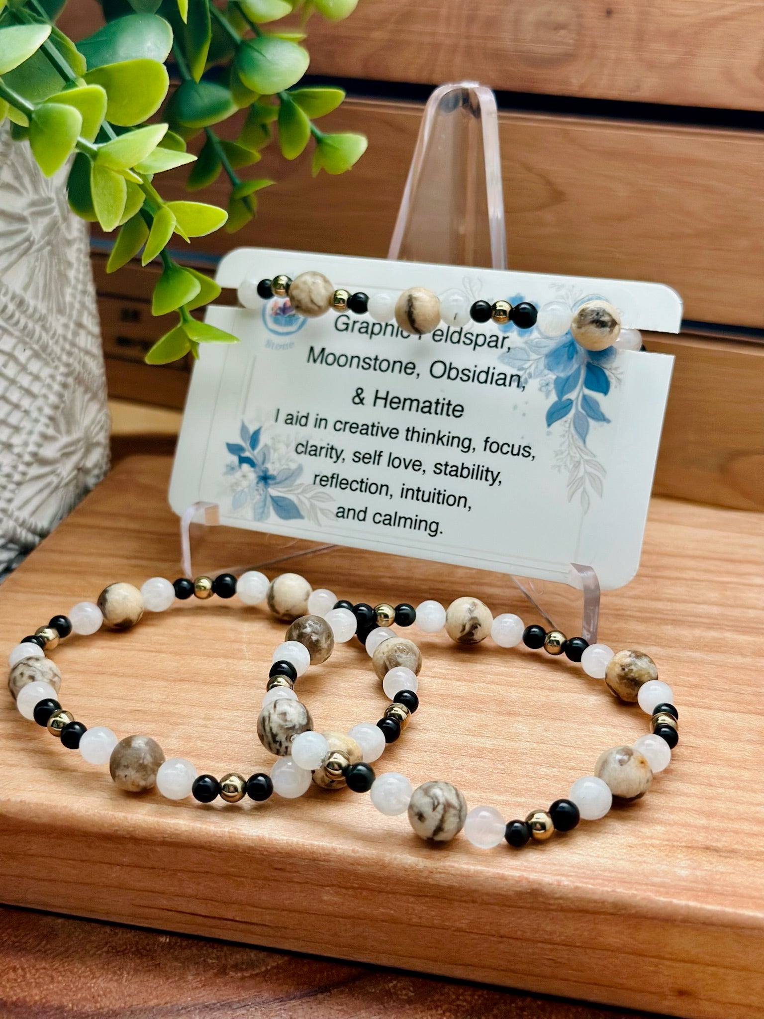 Graphic Feldspar, Moonstone, Obsidian, & Hematite Bracelet