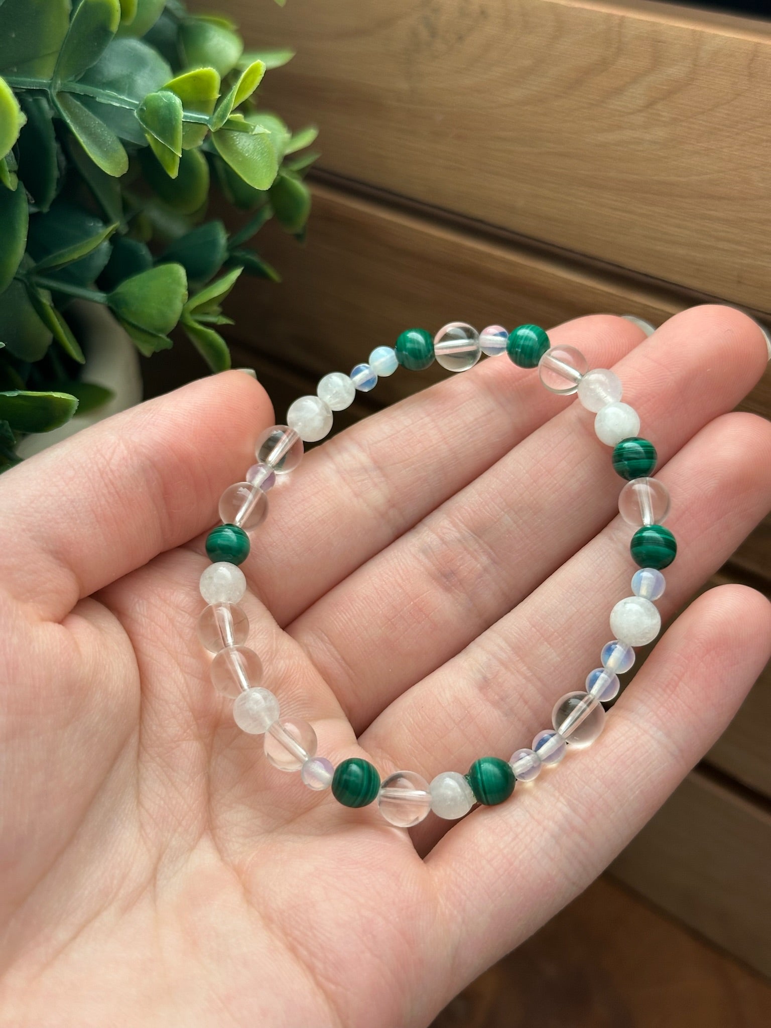 Malachite, Moonstone, Clear Quartz, and Opalite Bracelet