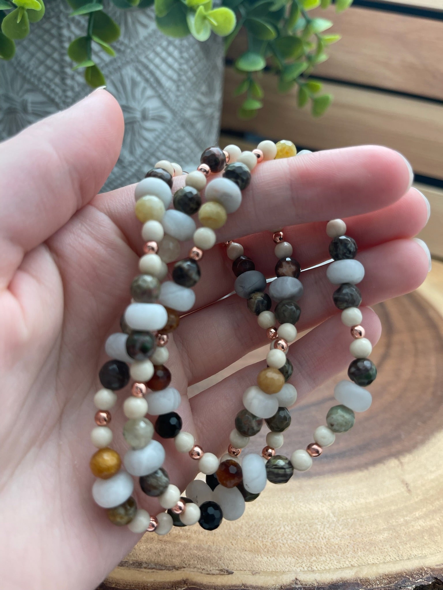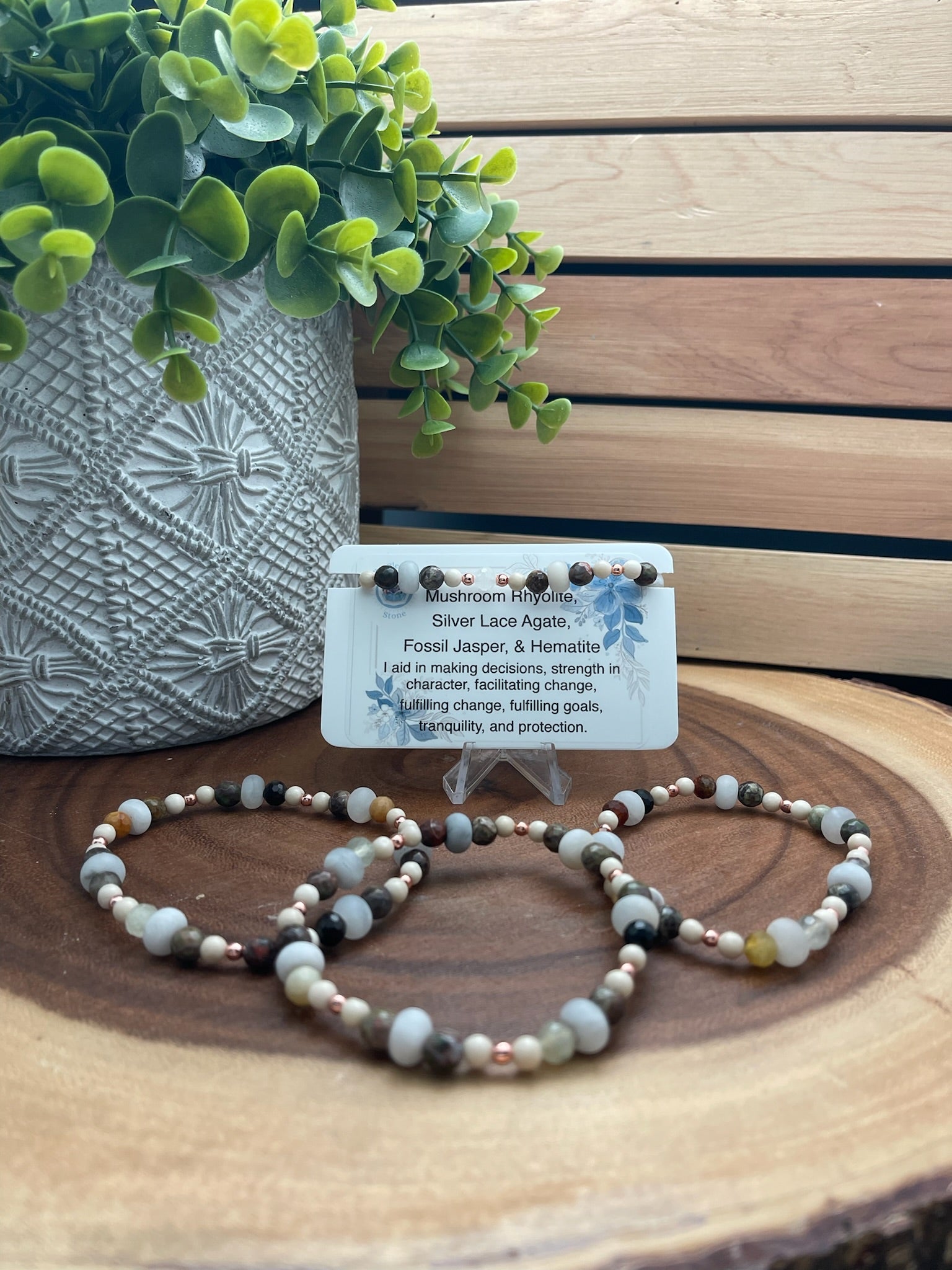 Mushroom Rhyolite, Silver Lace Agate, Fossil Jasper, and Hematite Bracelet