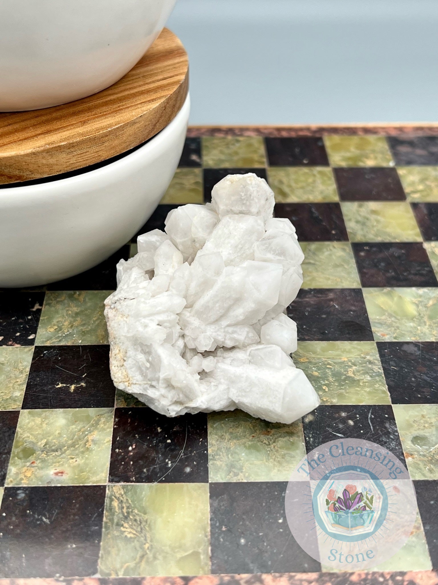 I am a Natural Quartz Cluster with black patina flecks. I aid in strength, vitality, and to help with grief.