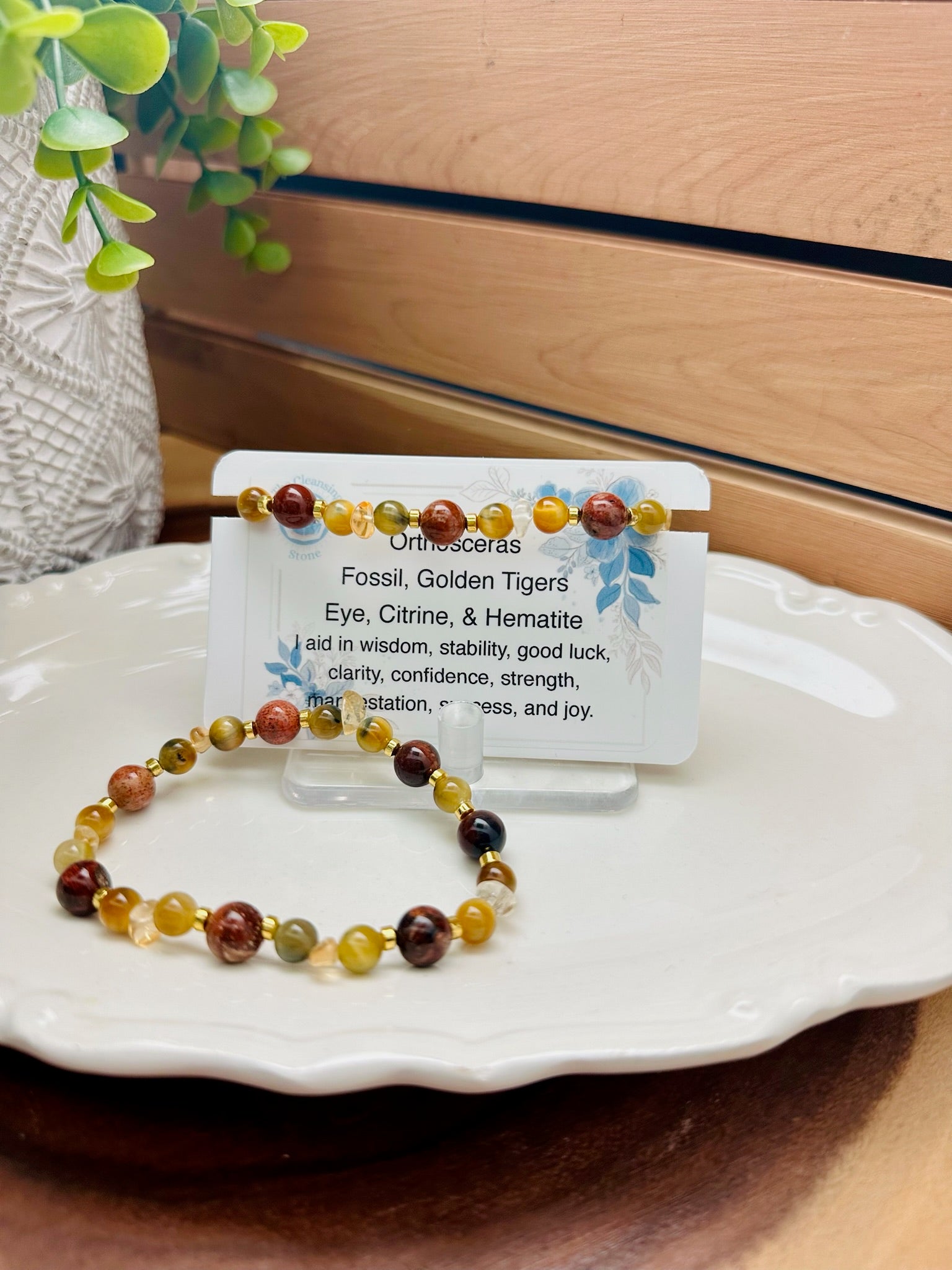 Orthosceras Fossil, Golden Tigers Eye, Citrine, and Hematite Bracelet