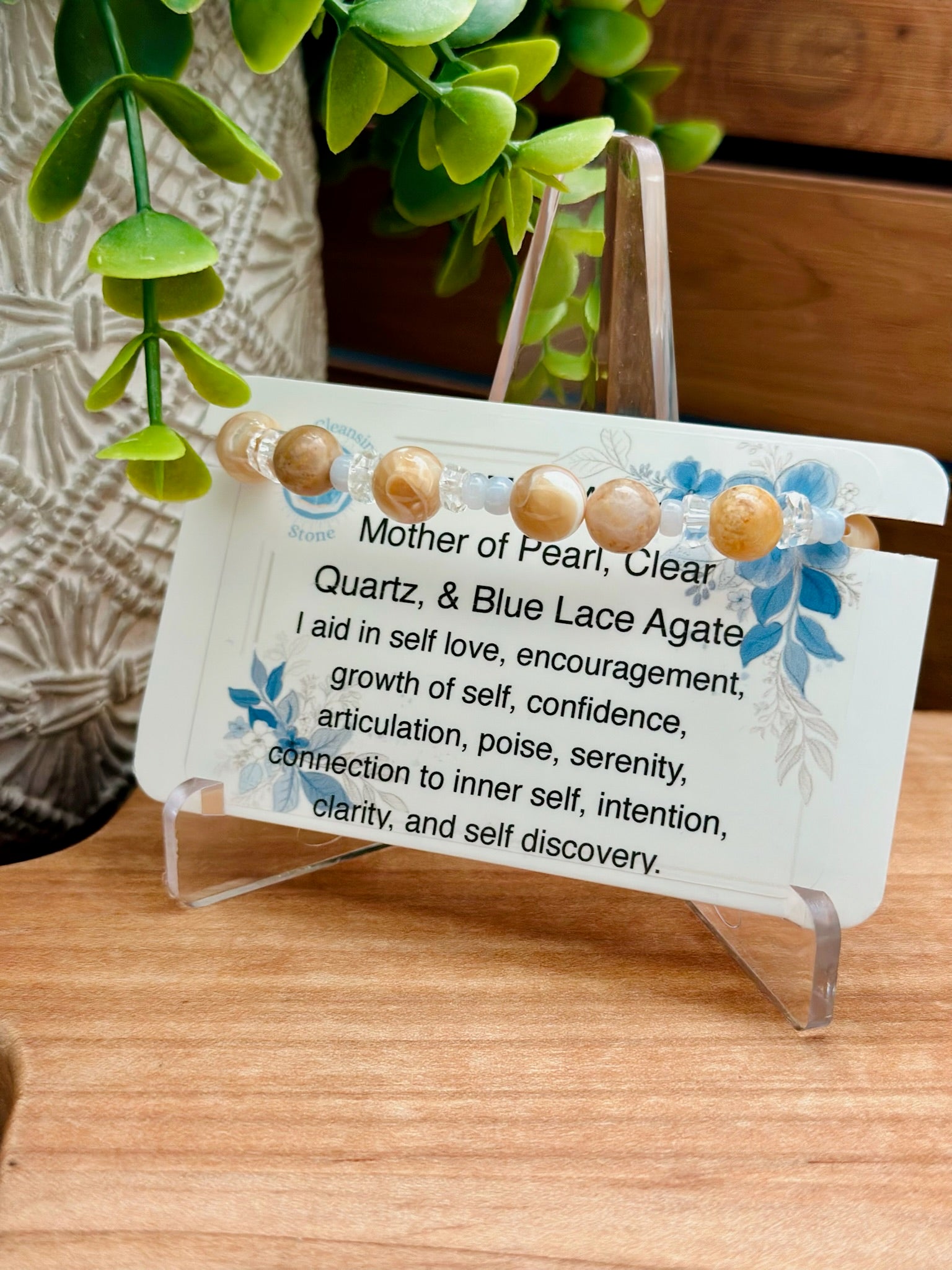 Pink Moss Agate, Mother of Pearl, Clear Quartz, and Blue Lace Agate Bracelet