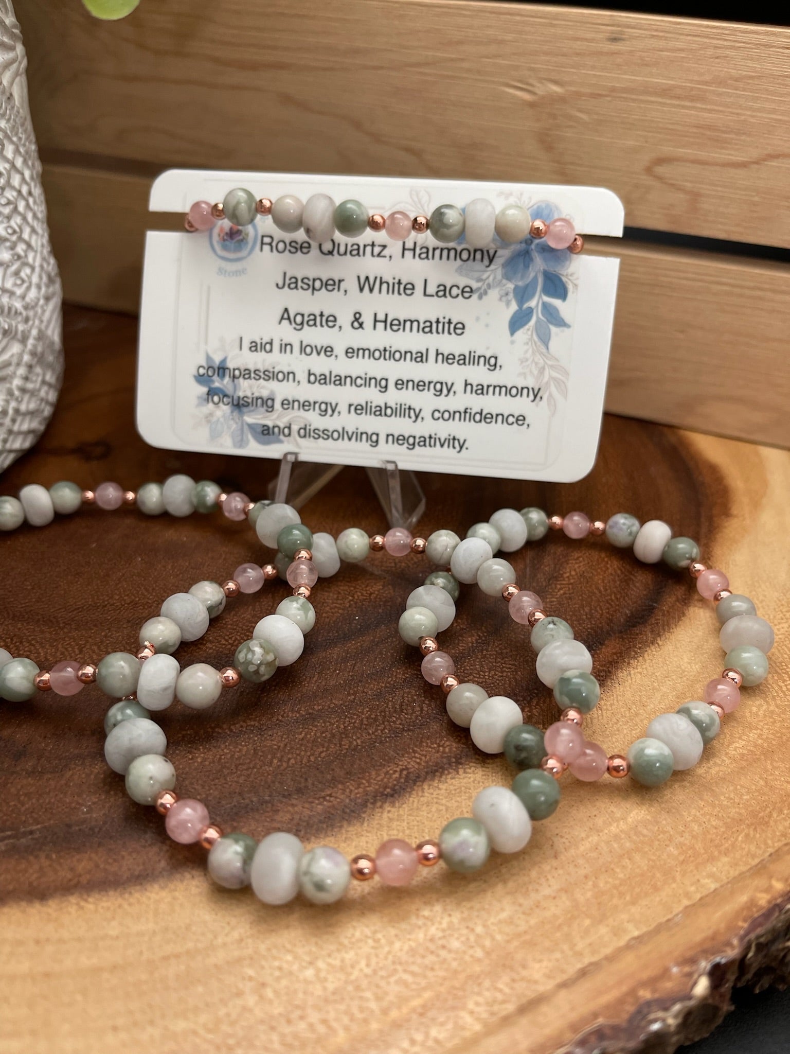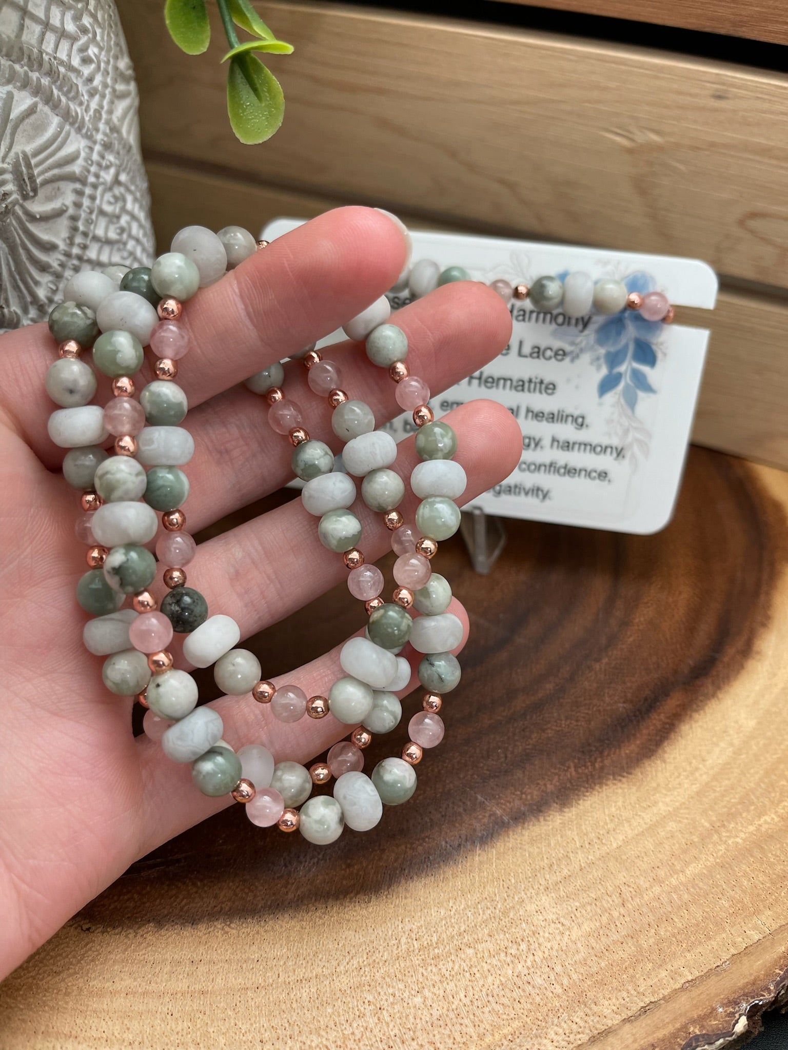 Rose Quartz, Harmony Jasper, White Lace Agate, and Hematite Bracelet