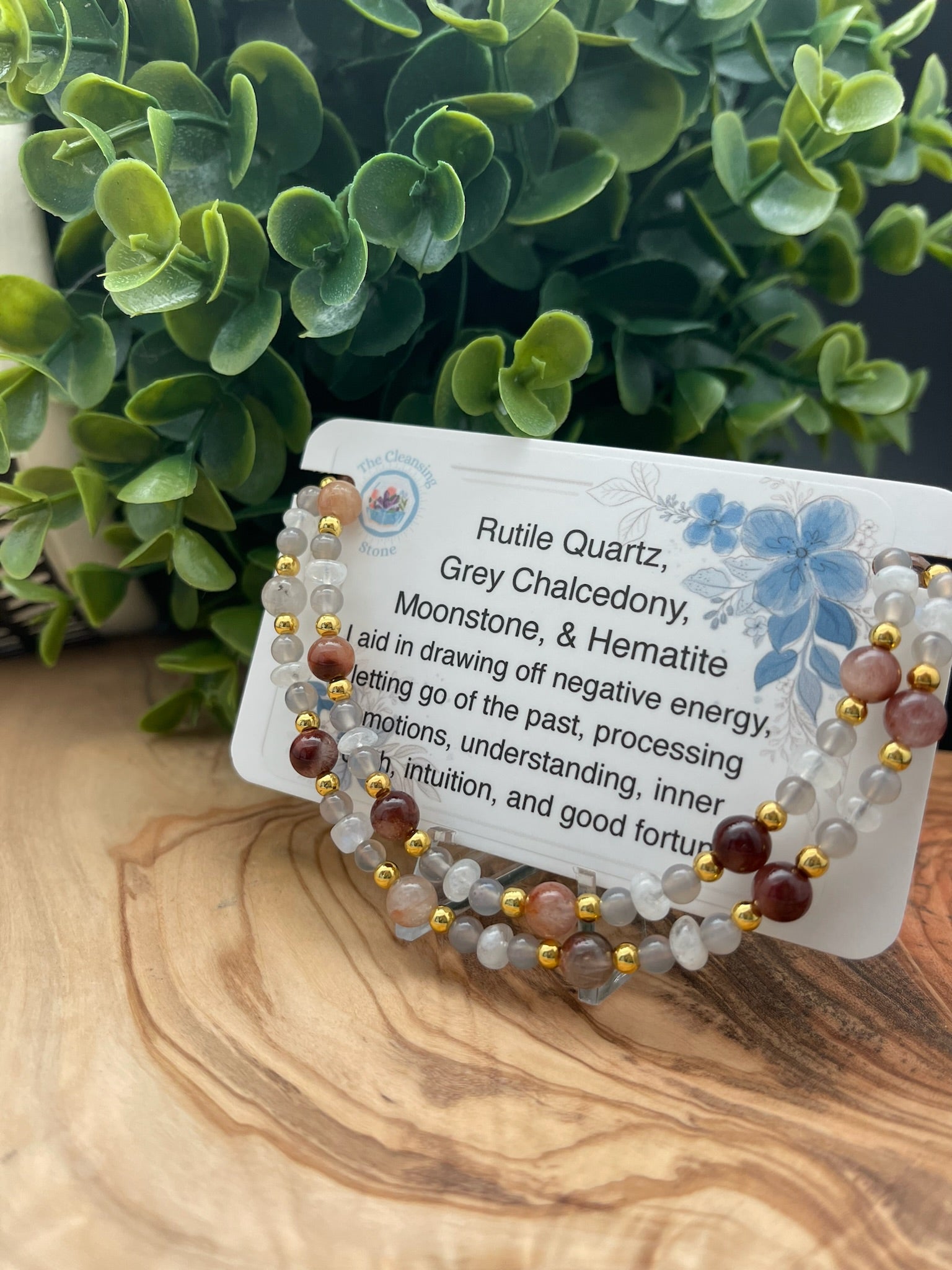 Rutile Quartz, Grey Chalcedony, Moonstone, and Hematite Necklace