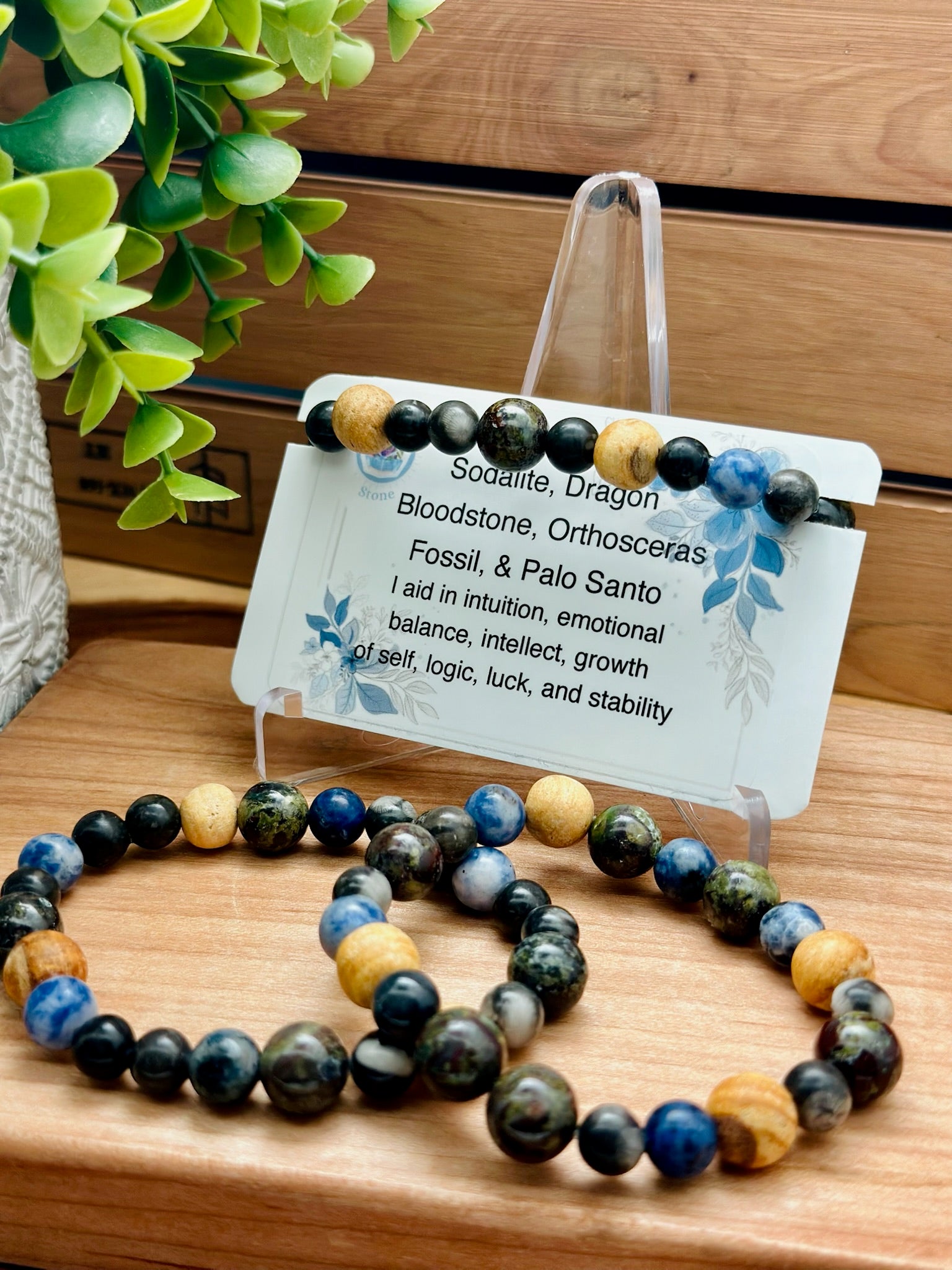 Sodalite, Dragon Bloodstone, Orthosceras Fossil, and Palo Santo Bracelet