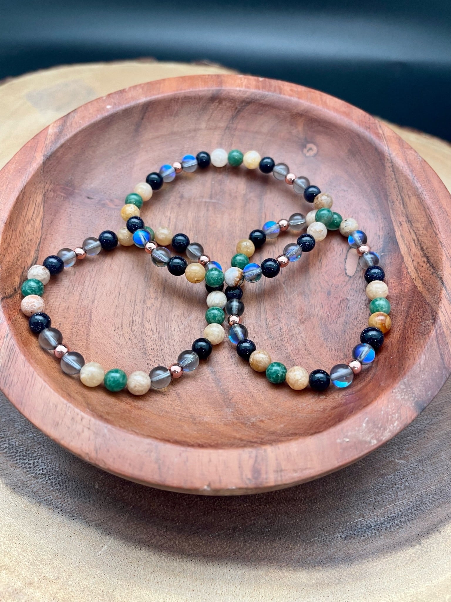 African Jade, Blue Goldstone, Pink Moss Agate, and Mystic Aura Quartz Bracelet